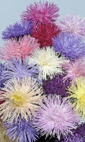 Астра харц Смесь окрасок. Смесь игольчатой астры с лучистыми соцветиями. Куст высотой 75см. Цветоносы прочные, упругие, 8-12 стеблей на растении. Соцветия диаметром до 16 см. Окраска самая разнообразная. Цветет август-сентябрь. Используют очень широко: для посадки в сборные цветники группами, на рабатки - рядами и на срезку.