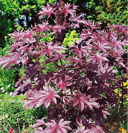Клещевина брнзоволистная Сангвинеус (Ricinus communis Sanguineus). Крупное травянистое растение высотой до 1,5 м. Стебель прямой, ветвистый. Листья крупные, красно-пурпурного цвета. Используется для декорирования стенок, посадки группами и одиночно на газоне.