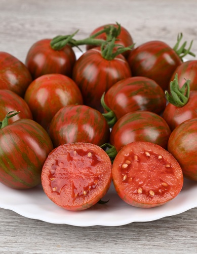 Томат Братец Полосатик - кистевой сорт с плотными пестрыми плодами.