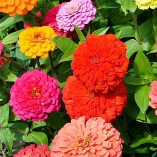 Цинния георгиноцветковая Пепито (дварф) микс. Растения устойчивые, компактные высотой около 30 см. Соцветия плотные, полушаровидные, крупные разнообразной окраски. Цветете июля по сентябрь. Используют для оформления клумб, рабаток и срезки. Великолепно подойдет для коврового цветника.