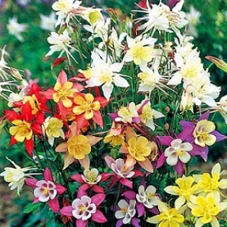 Аквилегия гибридная Мак Кана Джиант. Великолепная смесь изысканных окрасок. Изящное растение с ажурными сизоватыми листьями. Куст красивой формы, высотой 80 см. Цветы крупные. Цветет в мае-июле. Используют для посадок группами на клумбах, в травянистых бордюрах и на срезку. Срезку производят, когда распускаются первые 3- 5 цветков.