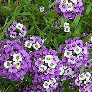 Алиссум Фиолетовая королева. Нежный аромат. Миниатюрное растение с мелкими цветками с медовым запахом. Растение невысокое, до 15 см. Образует плотный, стелющийся ковёр. Листья узкие, ланцетные. Цветет с июня до осени. Для непрерывного цветения периодически удаляют увядшие цветы и плоды (если не нужны семена). Используют для обрамления клумб, балконных ящиков, на каменистых горках, рокариях, для посадки между плитками дорожек.