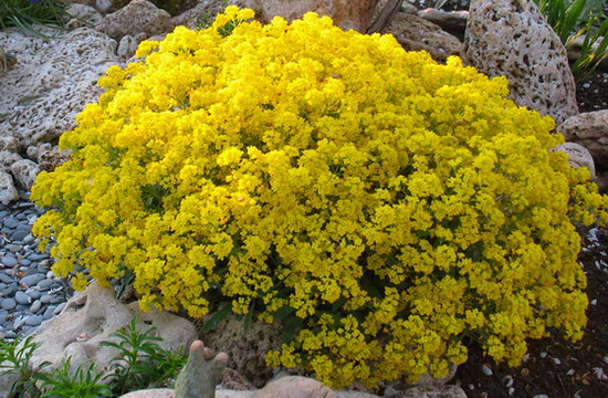 Алиссум скальный Золотая Россыпь. Растение образует густо разросшийся кустик высотой 15 см с серо-зелёной листвой, стебли ветвистые, в основании деревянистые. Кистевидные соцветия с мелкими душистыми светло-жёлтыми цветками. Обильное цветение на второй год с апреля по июнь. После цветения стебли укорачивают - это омолаживает растение и помогает сдерживать его рост. Используют на каменистых горках, в миксбордерах и бордюрах.