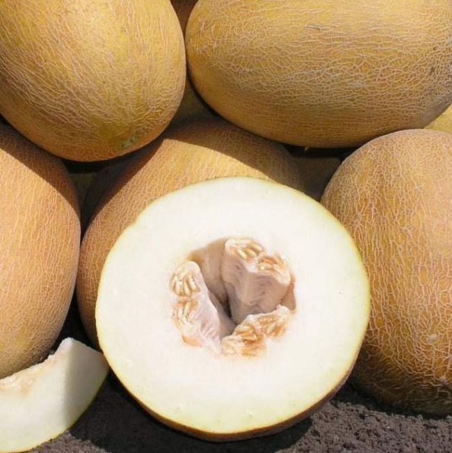 • Плоды овально-удлиненные, желтые, с легким оранжевым оттенком, массой от 2 до 3,5 кг, имеют плотную, равномерную сетку по всей поверхности.
