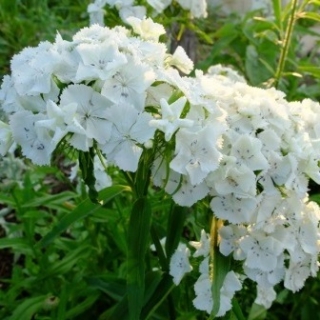 Гвоздика Турецкая Белая Королева. Кустик высотой 50 см. Листья линейно-ланцетные, зеленые. К концу 1-го года выращивания образуется розетка прикорневых листьев. На следующий год растения цветут с конца июня в течение месяца. Используют для сборных цветников, рабаток и для срезки.