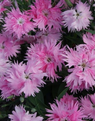 Гвоздика Супра (Dianthus interspecific Supra). Компактная межвидовая гибридная гвоздика с хорошим боковым ветвлением и крупными ажурными игольчатыми цветками до 4 см в диаметре.