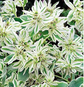 Молочай окаймленный (Euphorbia marginata). Красивый однолетний цветок из семейства Молочайные,  В цветнике кусты молочая очень похожи на “снежные шары”. Широкая белоснежная кайма, проходящая по краю верхних листьев, делает растение весьма декоративным. Растет молочай очень быстро и к осени достигает высоты 80-100 см. Зацветает в середине лета невзрачными мелкими цветками. Цветение длится до заморозков.