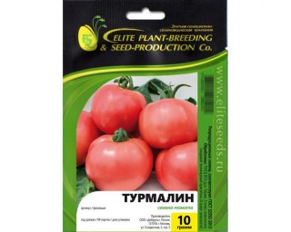 Томат Турмалин F1. Среднепозднего срока созревания - от всходов до созревания 114-121 дней в безрассадной культуре (Вегетативный срок, дней: 95-98 после высадки рассады). Растение детерминантное, мощное, среднерослое, полураскидистое, средневетвистое и среднеоблиственное. Лист обыкновенный, среднего размера, зелёный, среднегофрированный, соцветие простое с 3-5 цветками. Плод плоско-округлый, гладкий, с зелёным пятном рассасывающемся при созревании, розовый, прочный и транспортабельный хорошего качества. Средняя масса 140-180 г. Плодоножка без сочленения. Предназначен для потребления в свежем виде и переработки. Самая высокая устойчивость к растрескиванию среди розовоплодных томатов.