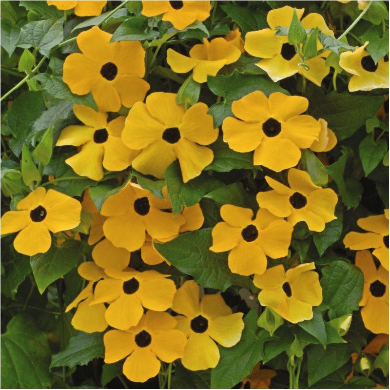 Тунбергия крылатая Оранжевая. Эффектные трубчатые цветки, достигающие в диаметре 5 см, отчетливо выделяются на фоне стреловидных листьев. Цветки оранжевые с тёмно-пурпурным центром. Цветет с июня по сентябрь. Применяют для украшения беседок, шпалер, колонн, балконов.